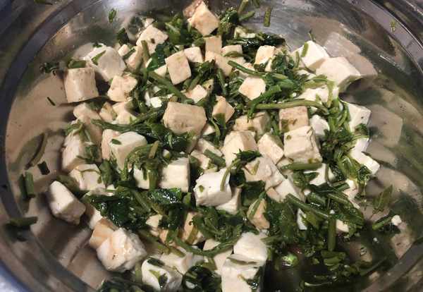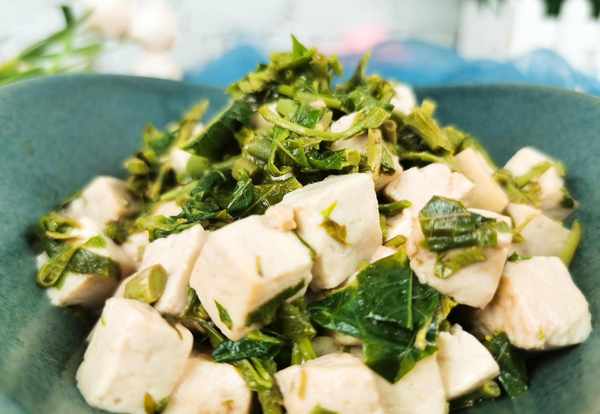食材:香椿、老豆腐、盐、鸡精、酱油、香油。