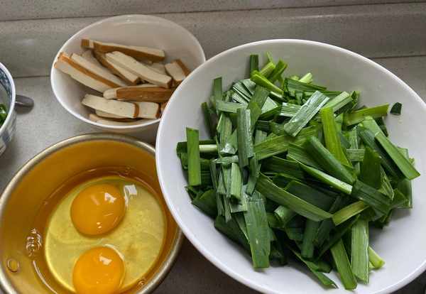步骤1:韭菜洗干净切段,香干切条,打2个鸡蛋在碗里。