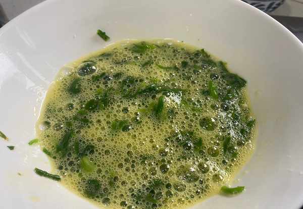 步骤1:荠菜清洗干净,然后起锅烧水,放入荠菜焯水煮熟,再捞出挤干水分,切碎备用。再荠菜里打入2个鸡蛋,加些盐搅拌均匀。