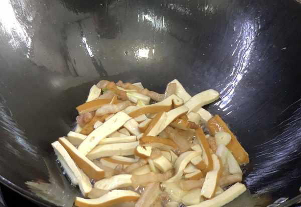 步骤3:锅中再加少许油,放入五花肉煸炒出油脂,再加香干和葱蒜煸炒片刻。