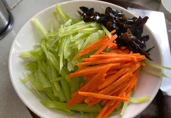 食材:莴笋、胡萝卜、黑木耳、醋、盐、鸡精、香油。