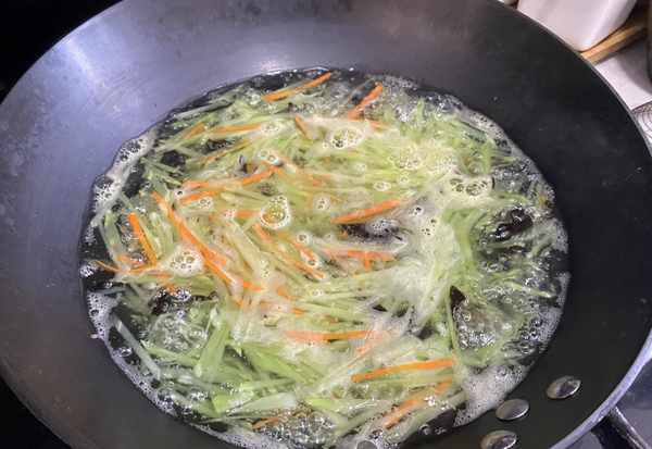 步骤1:莴笋去皮切丝,胡萝卜切丝,黑木耳泡发后切丝备用。