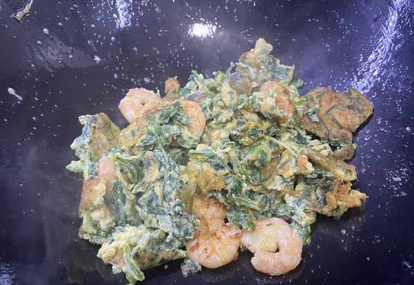 步骤3:起锅烧油,放入虾仁翻炒变色,再倒入荠菜鸡蛋液,加热凝固,最后翻炒均匀就可以出锅了。