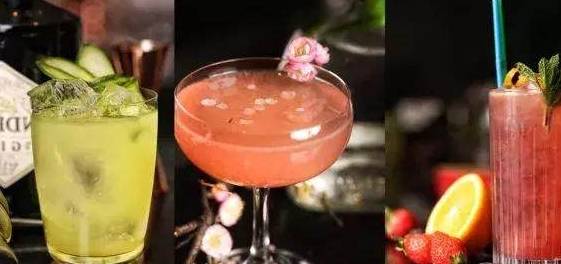 三款鸡尾酒从左至右为将军金酒(由青柠,接骨木花糖浆,黄瓜,罗勒,苏打水调制而成);奥美加龙舌兰酒(由樱桃力娇酒,柠檬,桃子力娇酒,蔓越莓汁调制而成);哈瓦那朗姆酒(由树莓糖浆,阿佩罗开胃酒,柠檬,橙汁,干姜水调制而成)。