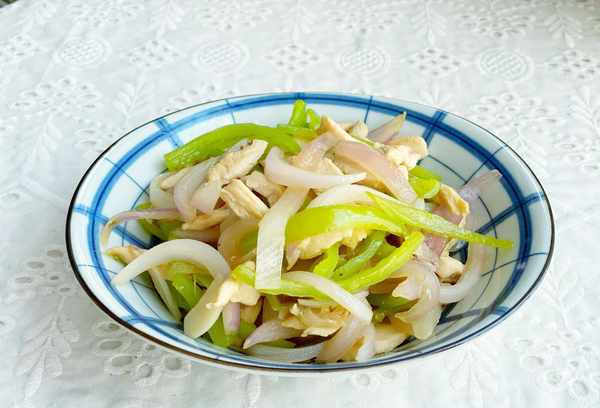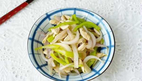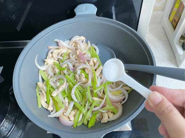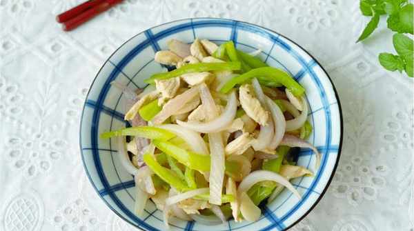 第七步:然后加入洋葱块,加入青椒块炒至碎,这样两者的香味才能融入到鸡胸肉中。