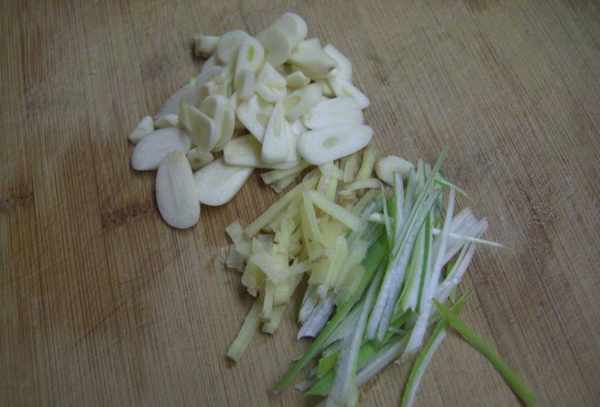 第三步:大蒜去皮,姜洗净切条,洋葱去烂皮切成薄片备用。