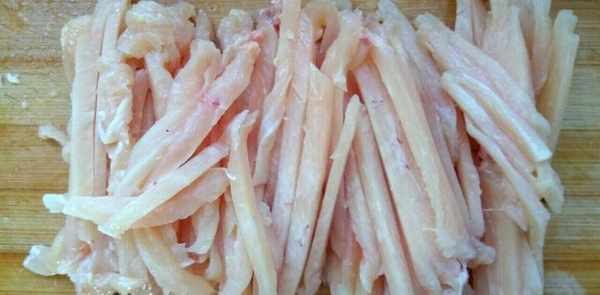 第一步:准备好三种食材,鸡胸肉反复清洗干净,剪掉表面的筋膜,鸡胸肉顺着纹路切成薄片,再切成细条备用,这样鸡胸肉更容易炸。.