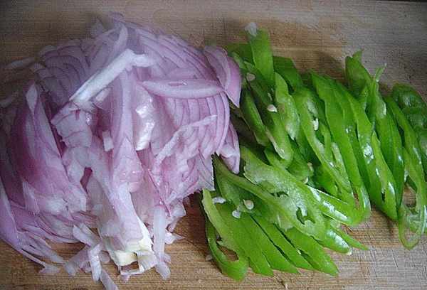 第二步:将青椒洗净,青椒去蒂去籽,青椒切成薄片待用,洋葱切掉多余的部分,将洋葱泡在冷水中,切成薄片。.
