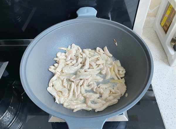 第六步:放入腌制好的鸡胸肉,用锅铲扒开,用大火快速均匀地煎至鸡胸肉颜色变白。