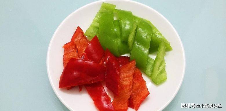 第二步:两个青椒洗净去蒂,红辣椒洗净去蒂,青辣椒切成菱形,红辣椒切成小块待用,大蒜几瓣压碎成蒜末。
