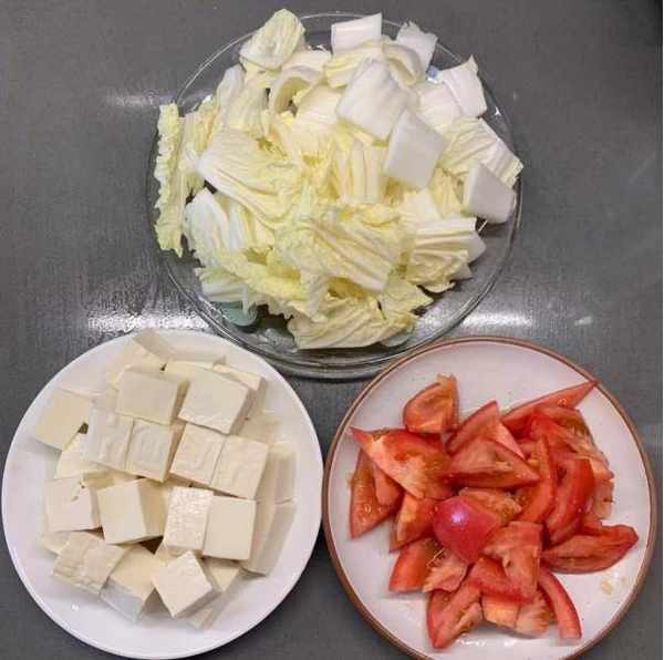 第一:买来西红柿、卷心菜和软豆腐,先把卷心菜的根切掉,把卷心菜洗干净,把叶和茎分开,切成小块沥干水分。