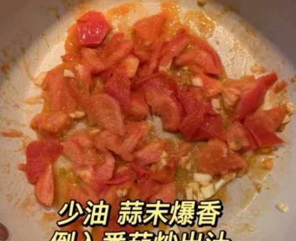 第五:锅底放少许油,放入番茄块,出番茄汁,放两大碗开水,放半勺番茄酱烧开。