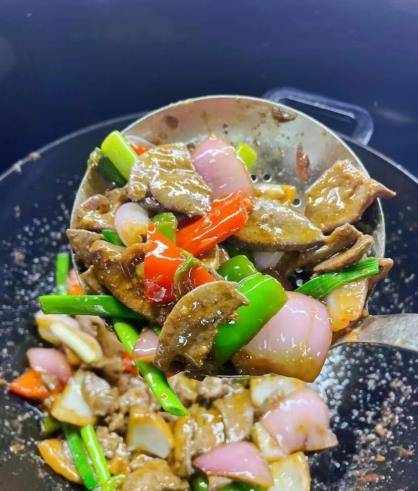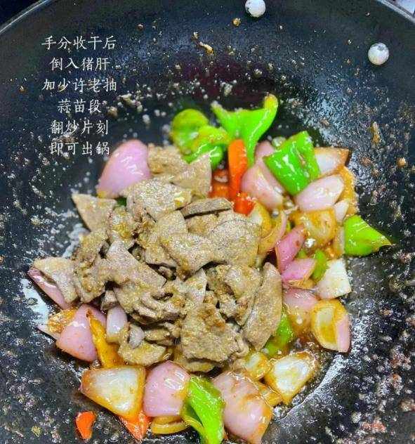 7:等水慢慢收干,倒入事先炸好的猪肝,加少许老抽,高温翻炒一分钟左右,放几颗蒜苗,加半勺鸡精,半勺糖和盐,加入更多的香料。
