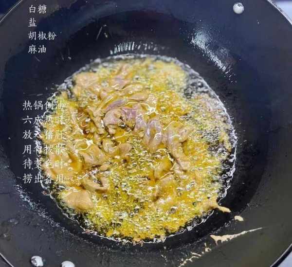 4:猪肝要味道很淡。猪肝一定要提前捞好腌好,加点料酒或者黄酒,加盐,半勺酱油,少许淀粉,最后淋上一些橄榄油锁住自己的水分。手捏一会儿,让猪肝片事先腌好。