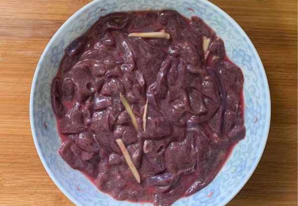 2:猪肝用冷水冲洗干净,切掉一些多余的部分,将猪肝逆纹切开,猪肝片用冷水冲洗或浸泡,中间换几次水,直到把里面的血水挤出来,然后用啤酒或黄酒浸泡,可以去除猪肝的血腥味。