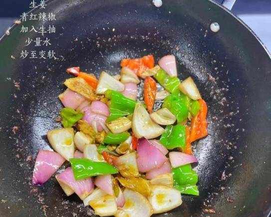 6:锅底放姜蒜,下洋葱和青红椒,快炒至断,加少许生抽,加少许水炒至配菜变软.
