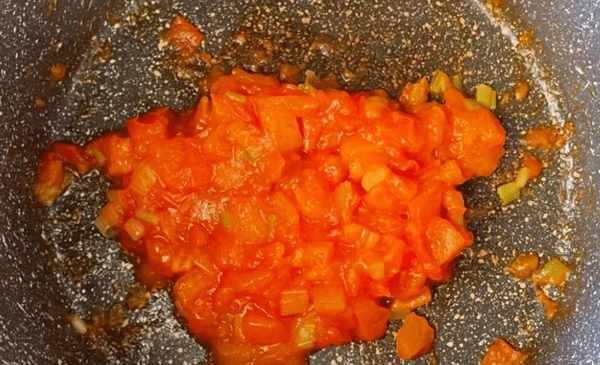 5:锅底倒入适量的食用油,待油热后下入小葱炒香,加入少许番茄块快速炒出番茄汁。