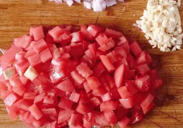 2:西红柿焯水好去皮,去皮切小方块,大葱切细条,小葱切根,大葱切碎。