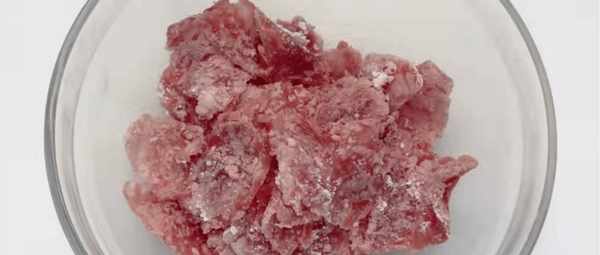 4:把玉米面放在碗里,用盐和胡椒粉把肉片腌好,把肉片裹在玉米面里,这样肉片特别鲜嫩,口感特别好。