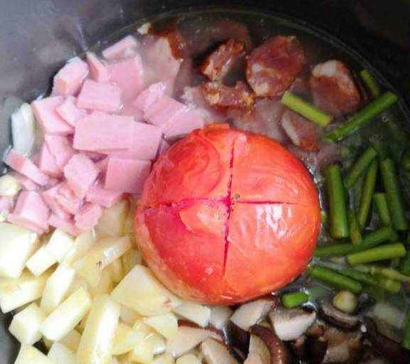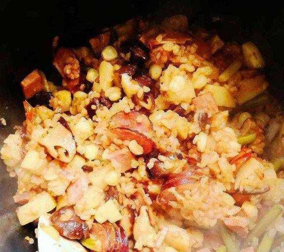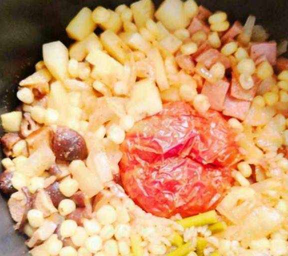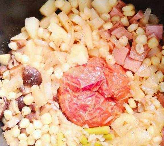 土豆丁西红柿一颗玉米粒香菇丁腊肠片火腿丁洋葱丁蒜苔段米饭水耗油,老抽,生抽,盐鸡汁,胡椒粉