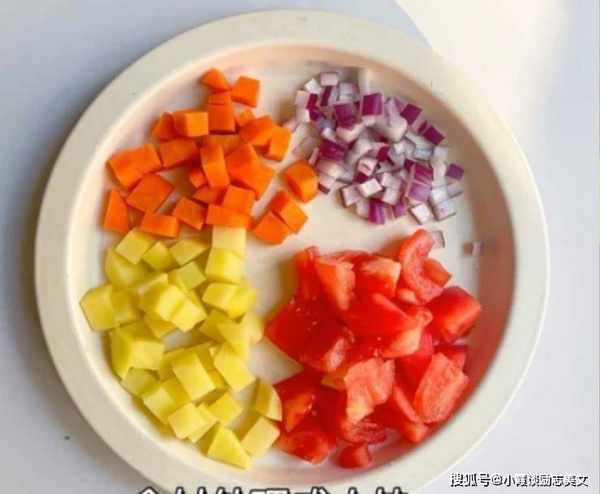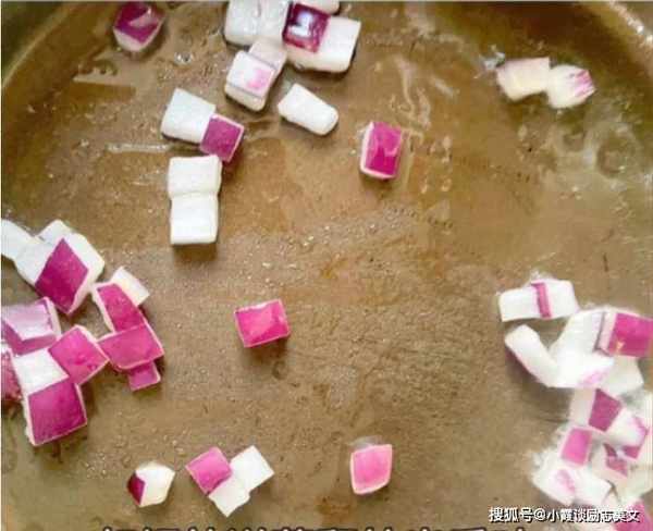 第四步:土豆去皮洗净,土豆切小方块,洋葱撕碎切小块。