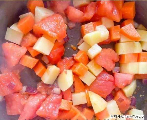 第七步:加入半勺番茄酱,加入切好的土豆和胡萝卜,快速搅拌片刻,加入几块玉米和牛尾骨,加入约1000毫升的水。