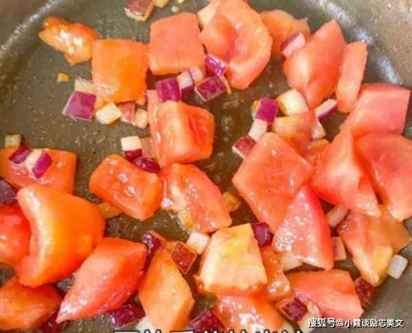 第六步:锅底放少许食用油,放入洋葱几片,姜末和蒜末少许,炒香,倒入番茄块,拌入番茄汁。
