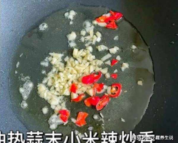 第六步:锅底烧热,加入少许橄榄油,加入切碎的大蒜和蒜清,加入少许辣小米,大火快速翻炒几下。
