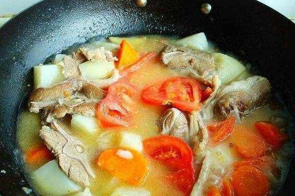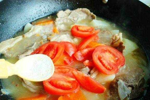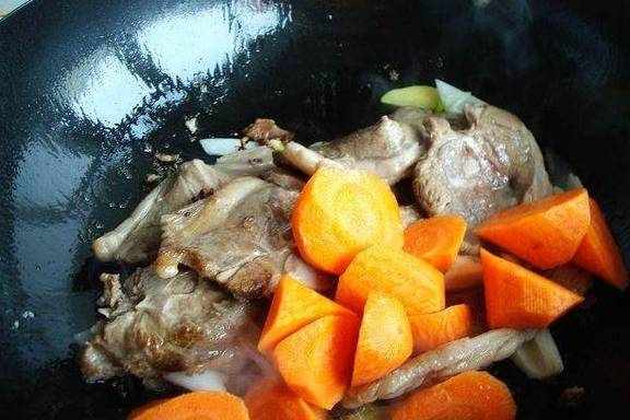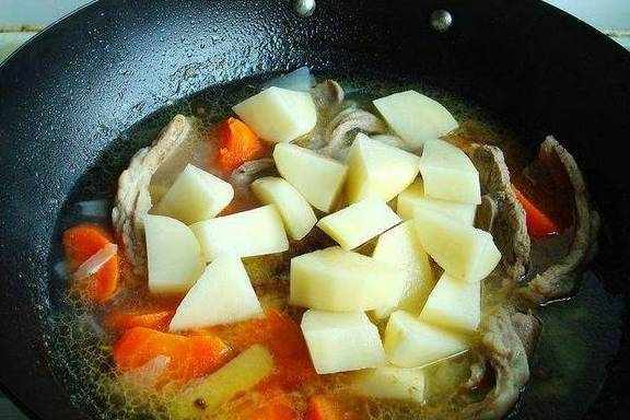 6、加土豆、盐翻炒均匀,再炖到羊排熟透