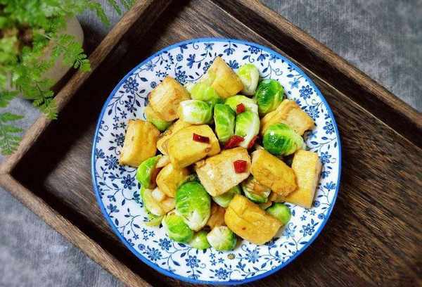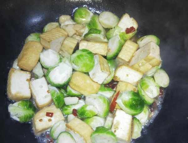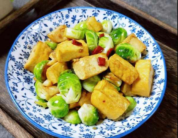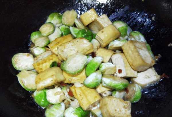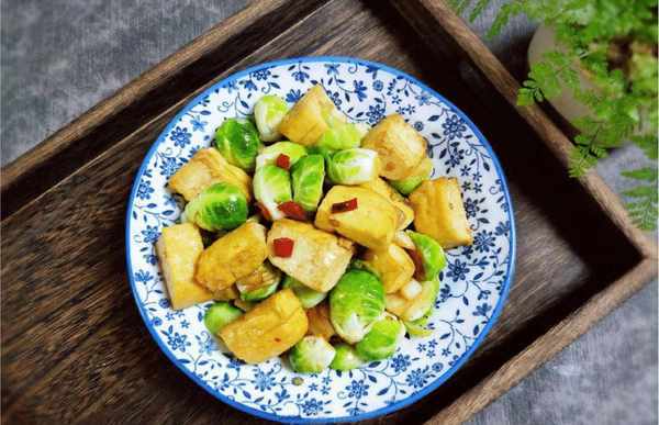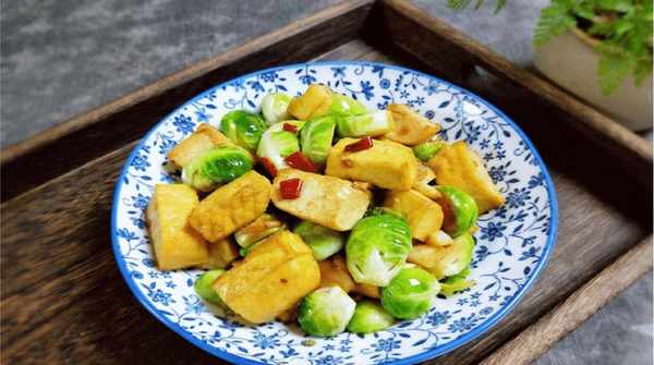 烹饪技巧:需要掌握购买甘蓝孢子和豆腐干的技巧。豆腐干需要用热水短时间浸泡。这道菜的顺序很难掌握。