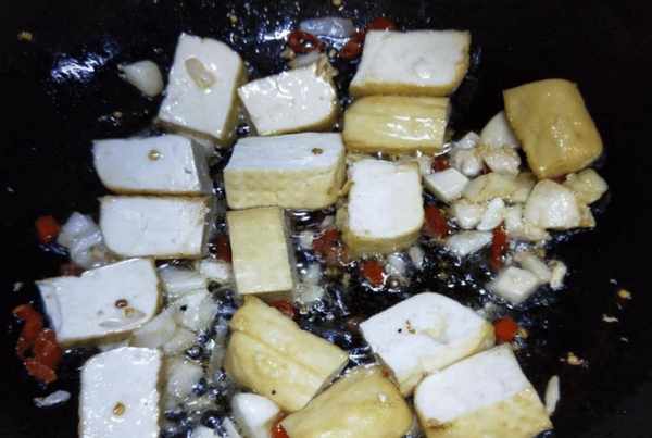 3:起锅烧热底,加入香油和少许蒜蓉,快炒出蒜香,放入切碎的干豆腐,两面煎黄一点。