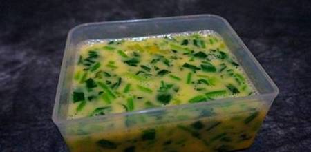 3.鸡蛋液调好以后加入切好的菠菜碎。搅拌均匀以后不要急着上锅,我们让它静置一下。我用了这样一个模具,整出来以后就能切成好看、规则的形状了。