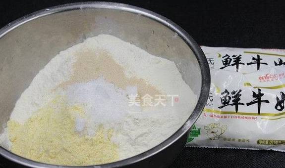 1.将两种面粉,酵母,白糖混合,牛奶微波加热成温牛奶。