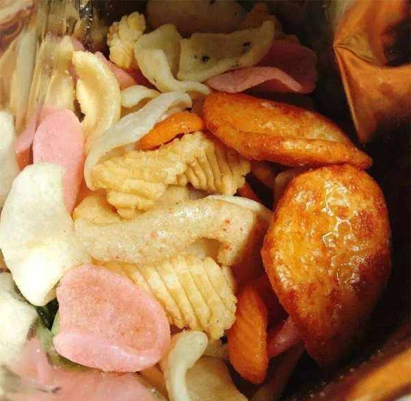 这应该是年代比较久远的膨化类食品了吧。颜色鲜艳,口味也多变,吃起来一嘴油。