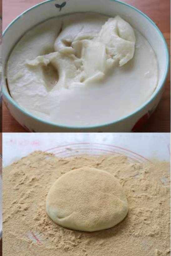 第四步:拿一个干净的东西垫着然后撒上熟的黄豆粉,再把糯米团放上去,表面上也撒点熟的黄豆粉