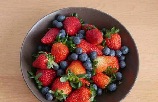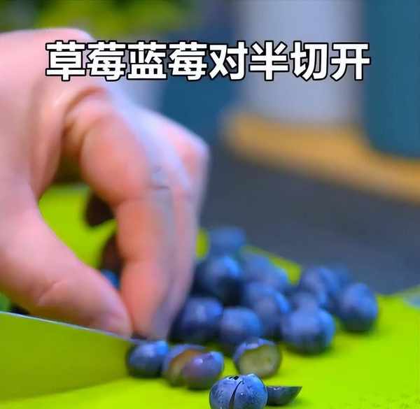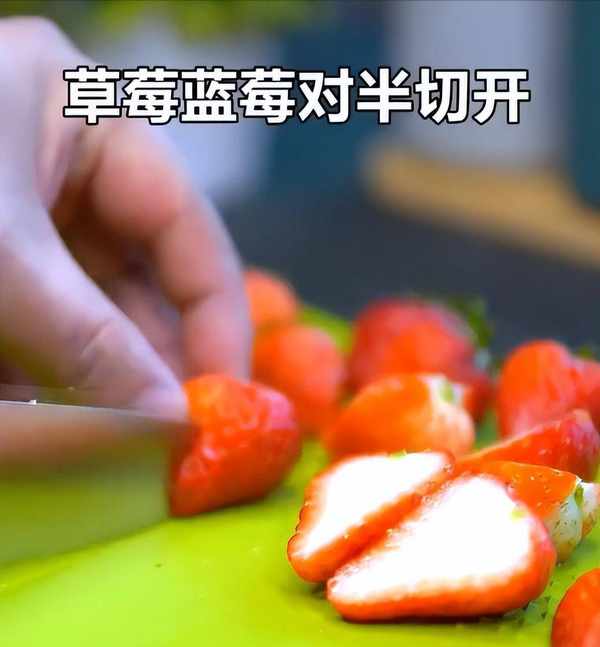 开始制作喽,首先将草莓和蓝莓洗净,用刀对半切开。