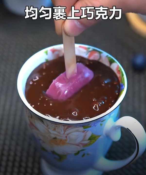 雪糕冷冻4小时后取出脱模,将雪糕均匀裹上坚果巧克力液,再冷冻1个小时,这脆皮雪糕就做好了。