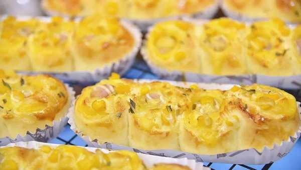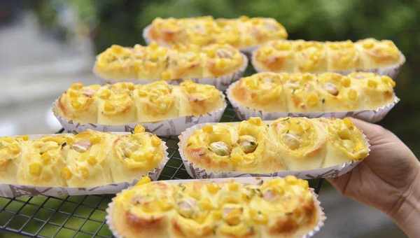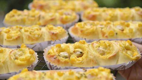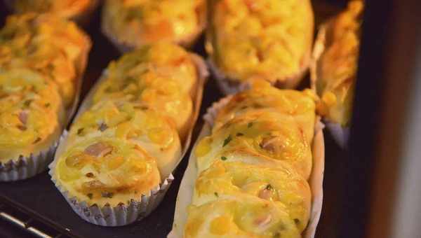 乍一看,金黄色面包好像盛开的四朵小花,小花里面有德式香肠,有芝士片,表面是颗颗玉米粒和点点干葱碎,还在烤箱里的时候就已经分外诱人了,喜欢吃咸口面包的小伙伴是不是已经开始咽口水了?
