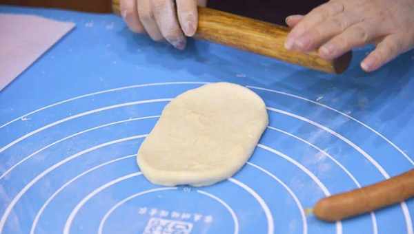 6.松弛完成,用擀面杖将面团擀为方形,光滑面朝下放置,再放上芝士片和完全解冻擦干水分的德式香肠,裹起来,裹到收口处时先将末端按薄之后再裹;