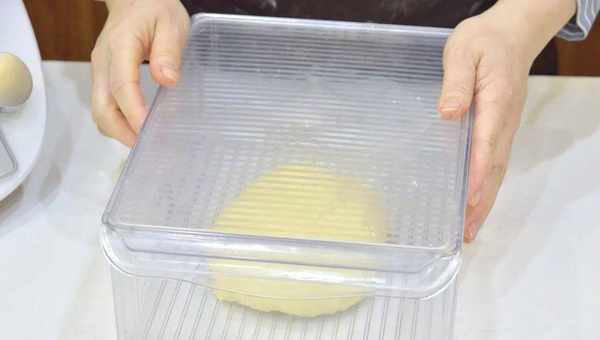 4.取出揉好的面团收圆,放入醒发盒中,室温下醒发60-90分钟;