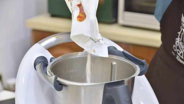 2.再将面团部分除黄油、海盐以外的其他材料,全部加入小美锅中,设定时间30秒转动速度旋钮从3到6混匀至看不到干粉;