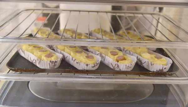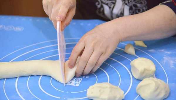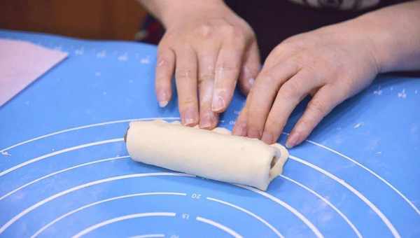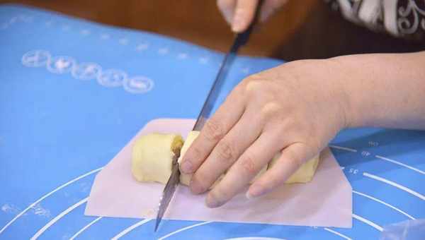 7.裹好的面团用刀切分为长度相等的四段,按照合适间距切口朝上摆入船型纸托中;