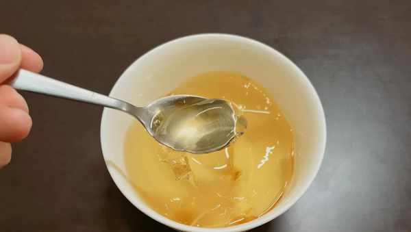 3.凝固好的罗汉果菊花膏分切成小块,然后加上一点蜂蜜或者炼奶食用。