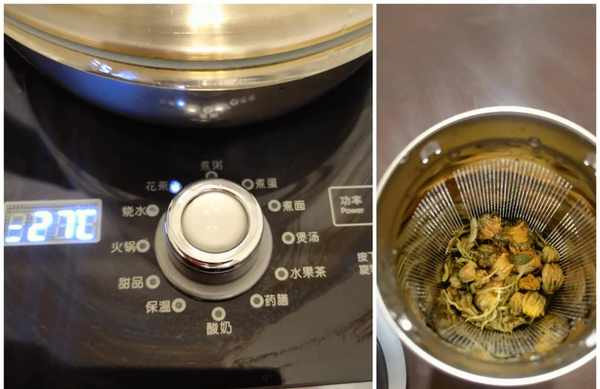 1.把罗汉果、菊花、金银花清洗干净,然后放进养生壶,并且倒入清水,选择“花茶”按键。