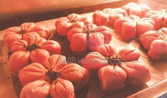 8.此时烤箱上下火170度预热10分钟。桃花酥中间放一点点蛋黄液和芝麻。