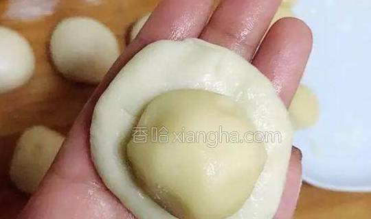 5.拿起一个面,中间按一下,擀成片,包馅儿,搓球。
