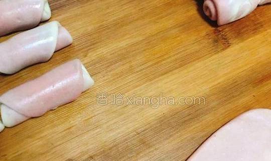 4.擀成牛舌状。从下用手心搓起,大致能卷起3-4圈。全部擀好后盖膜松弛20分钟。然后重复上一步骤,把面擀成牛舌状,卷起,盖好膜,松弛20分钟备用。