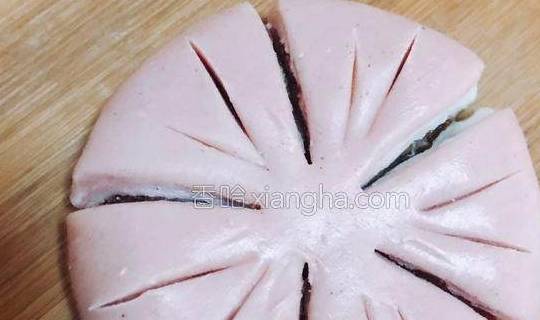 6.球擀扁或按扁,先切5份,然后每个花瓣上划两刀。注意不要切到太中间,烤好容易掉花瓣。