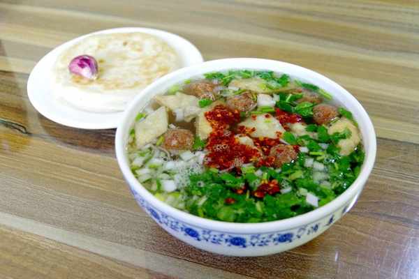 这一碗是羊杂汤。 敦煌的羊杂,是我在西北城市游历中印象最好的,选用的部为主要是羊肚,羊肠