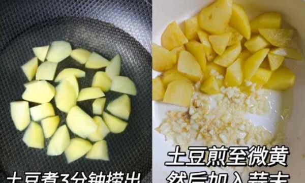 5:锅底烧热加上油,倒入茄子块煸炒,将茄子炒至变软,盛出备用,锅底留少许油,加上一些蒜末和洋葱丁,加上土豆块,迅速翻炒一会儿。